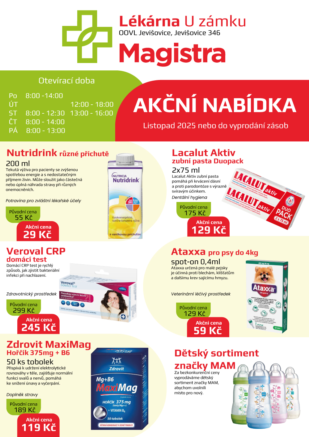 Jsme členem sdružení soukromých lékáren Magistra. Každý měsíc slevy volně prodejných léčiv a potravních doplňků. Pro majitele zákaznické karty a uživatele mobilní aplikace jsou slevy u vybraných produktů ještě výhodnější.